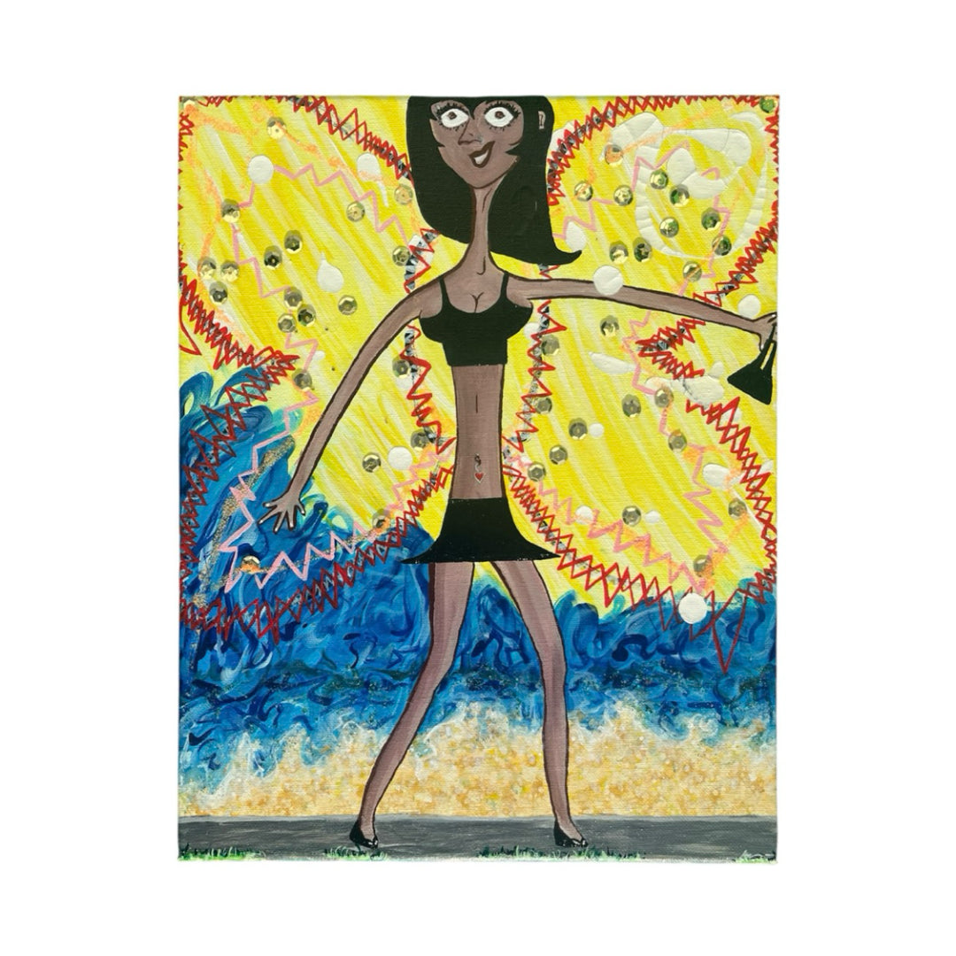 - Materials: Acrylic paint, sequins, glitter & ink pen on canvas