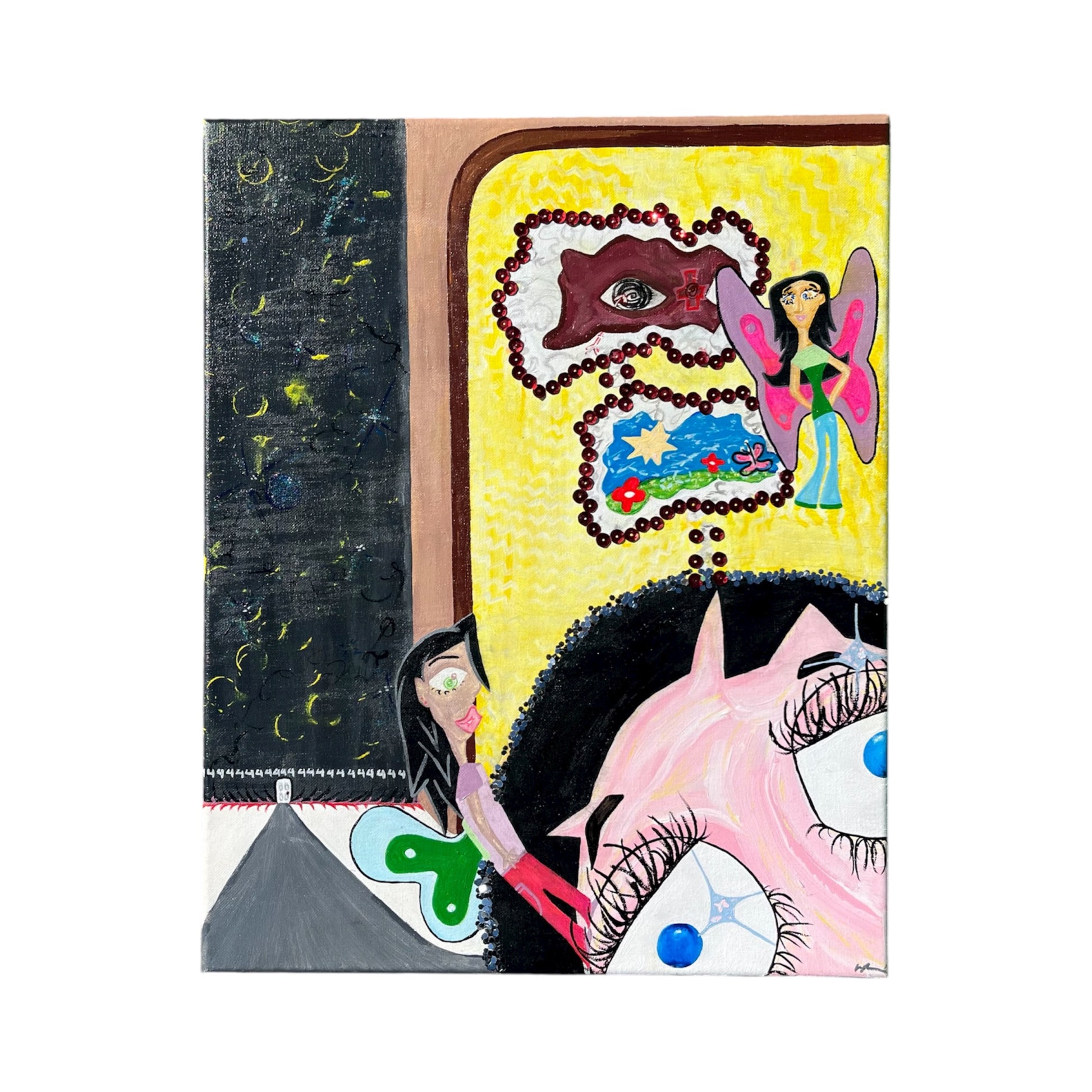 - Materials: Acrylic paint, sequins, glitter, watercolor & ink pen on canvas